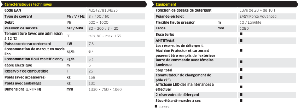 Débit l/h 500 – 1000 Pression bar / MPa 30 – 200 / 3 – 20 Température (eau d’alim. à 12 °C) Température max. eau (°C) 80 / 155 Puissance raccordée kW 7,8 Consommation de gazoil de la chaudière en pleine charge kg/h 6,4 Consommation de gazoil de la chaudière en mode eco!efficiency kg/h 5,1 Réservoir de combustible l 25 / Poids kg 168 / Dimensions (l x L x h) mm 1330 × 750 × 1060 / Equipement Poignée-pistolet EASY!Force Advanced / Affichage par LED des maintenances à effectuer / Flexible haute pression m 10 / Longue durée d’utilisation / Double réservoir de détergent / Lance mm 1050 / Sécurité manque d’eau / Power buse / ANTI!Twist / Système antivrillage / Les réservoirs de détergent et carburant peuvent être remplis de l’extérieur / Panneau de contrôle avec LED